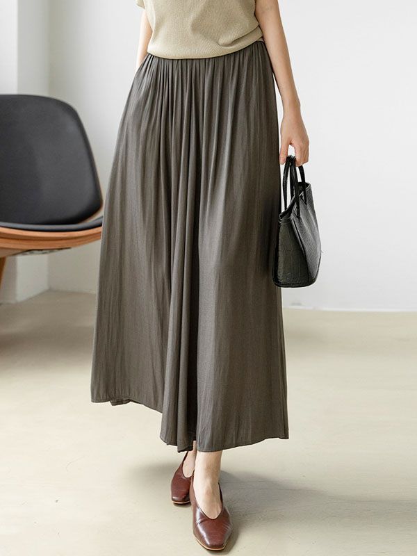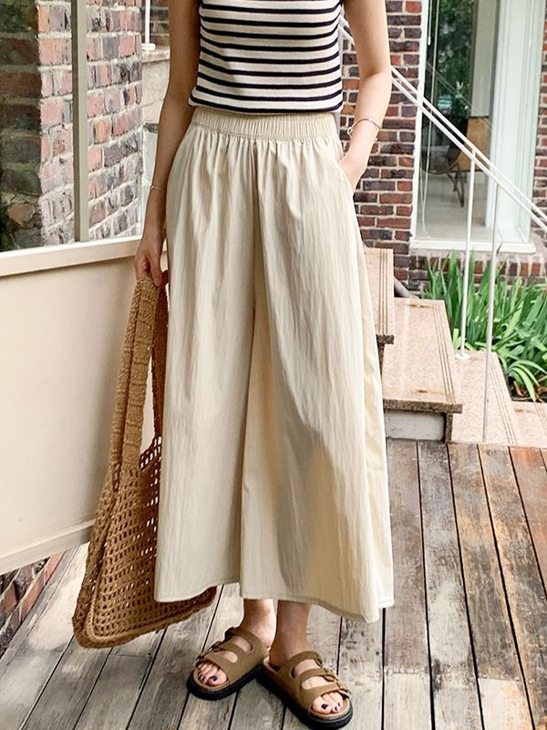 【C55226】韓國CAN 冰絲涼感寬褲裙-素面全腰鬆緊雙口袋A字長褲_影片★★