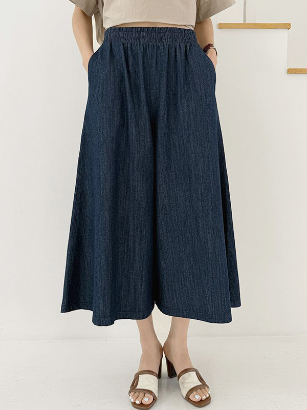 【C55144】韓國JOA 棉質牛仔寬褲-素面全腰鬆緊寬鬆A字雙口袋八分褲★★