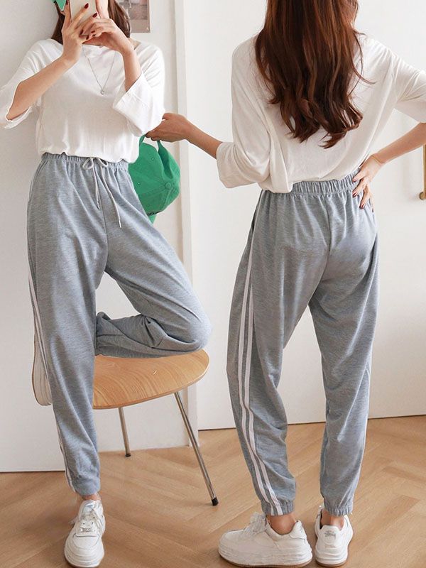 【C55279】韓國SEW 側條紋錐形褲-運動束口褲管寬鬆綁帶九分褲★★