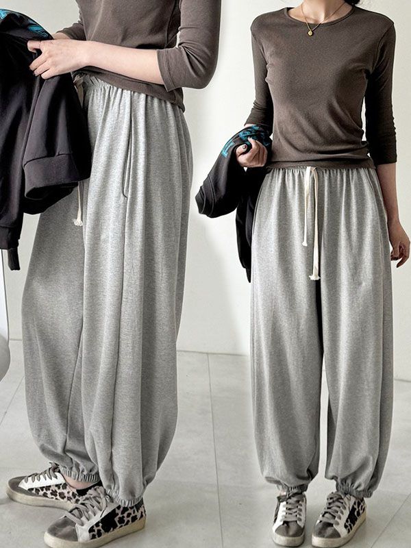 【C55305】韓國DLY 抽繩腰束口棉褲-綁帶腰素面輕薄運動長褲★★