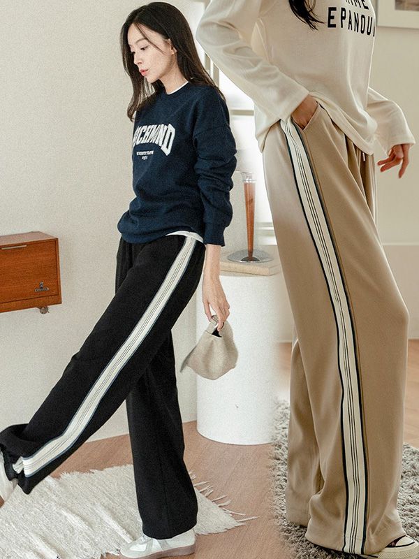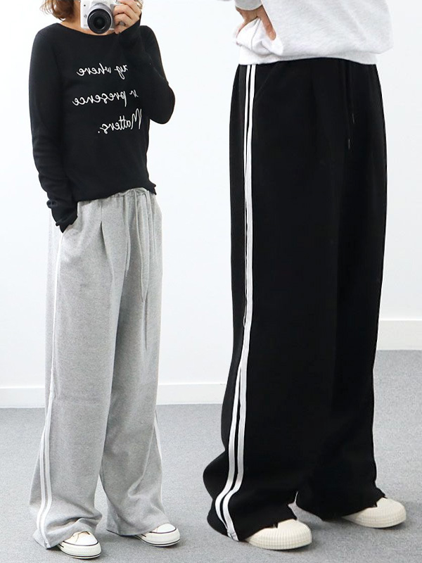 【C55419】韓國MIS 雙線運動褲-側邊白條紋抽繩鬆緊腰直筒寬褲長褲★★