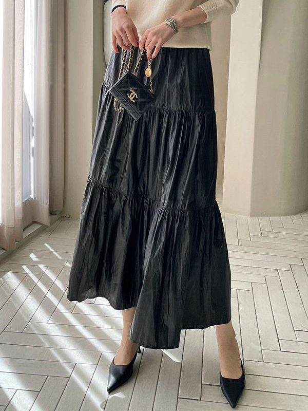 【C55537】韓國MNR 光澤傘狀皮裙-素面鬆緊腰木耳邊皺感蛋糕長裙