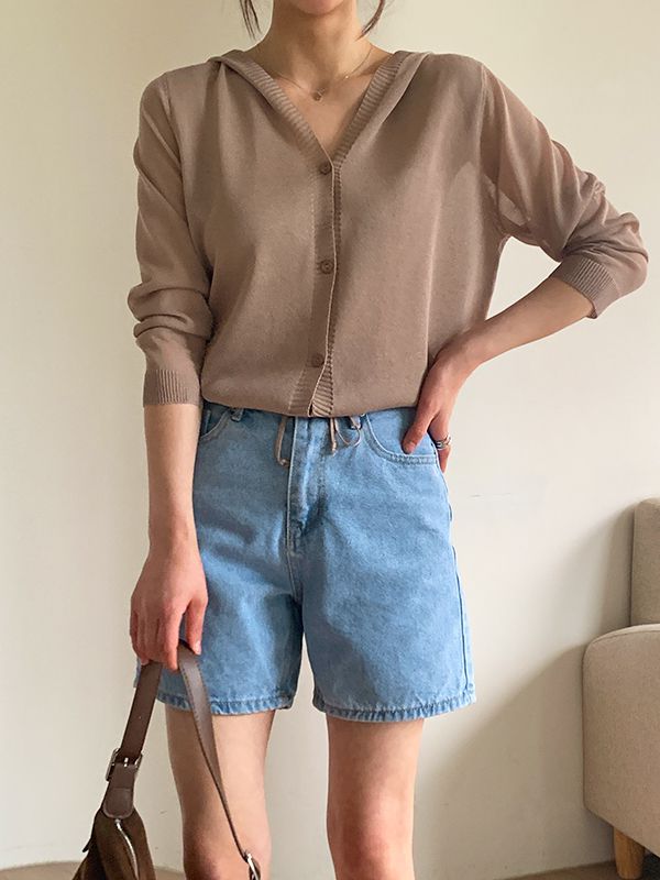 【C54958】韓國DAE 連帽針織外套-素面輕薄微透膚抽繩腰長袖上衣★★
