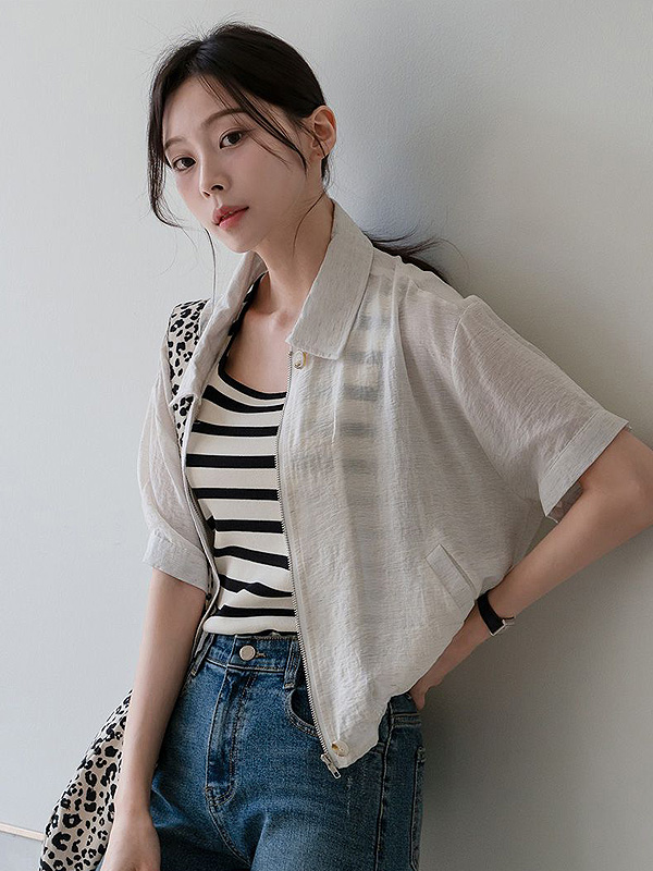 【C55061】韓國CAN 束口下襬外套-素面防風拉鍊雙口袋收腰五分袖夾克
