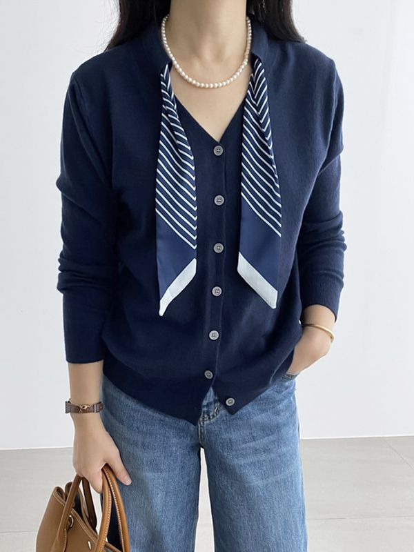 【C55458】韓國RUN 絲巾領針織衫-條紋領巾V領排釦長袖上衣外套★★