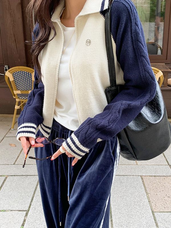【C55489】韓國TMO 撞色針織外套-條紋滾邊雙開拉鍊翻領短版長袖外套★★