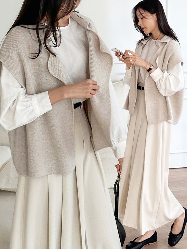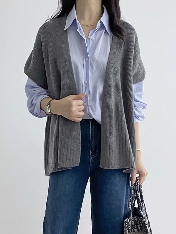 【C55490】韓國PUR 雙領針織外套-混羊毛素面包肩短袖開襟無釦罩衫