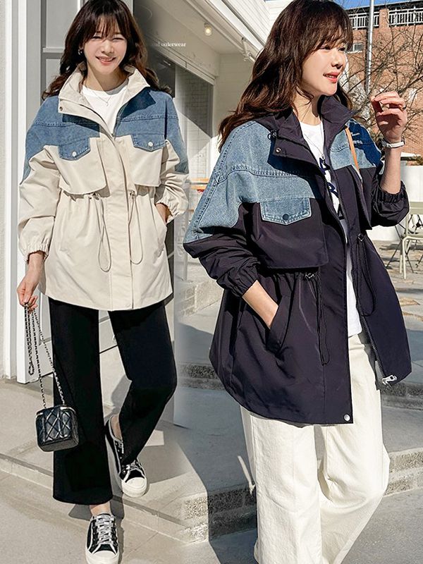 【C55524】韓國JAM 牛仔拼色夾克-素面抽繩收腰長袖連帽拉鍊外套★★