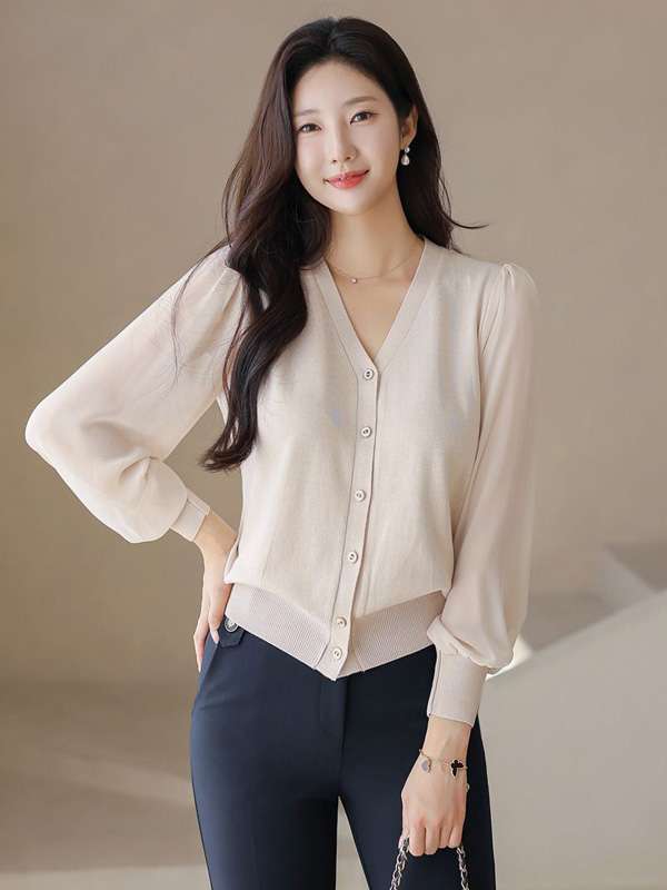 【C55526】韓國SOM 雪紡拼袖針織衫-素面透膚寬袖V領長袖上衣外套★★
