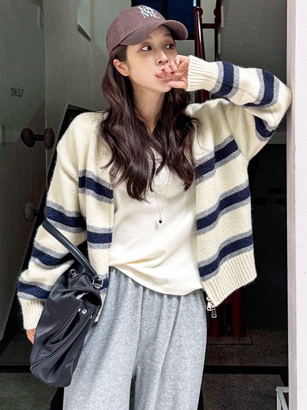 【C55534】韓國MBL 雙色條紋外套-圓領雙開式拉鍊短版混羊毛針織長袖★★