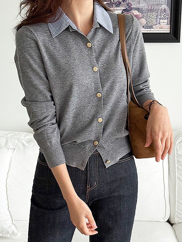【C55558】韓國JOA 雕花金釦針織衫-假兩件拼接條紋領長袖上衣外套★★