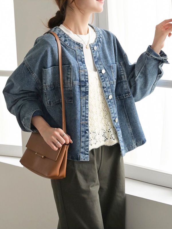 【C55593】韓國DLY 圓弧領牛仔外套-素面雙口袋側開衩寬鬆短版長袖★★
