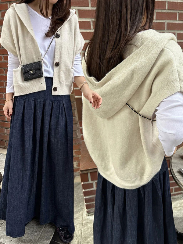 【C53359】韓國MBL 針織連帽背心-素面寬鬆長版側開衩無袖拉鍊外套_影片★★