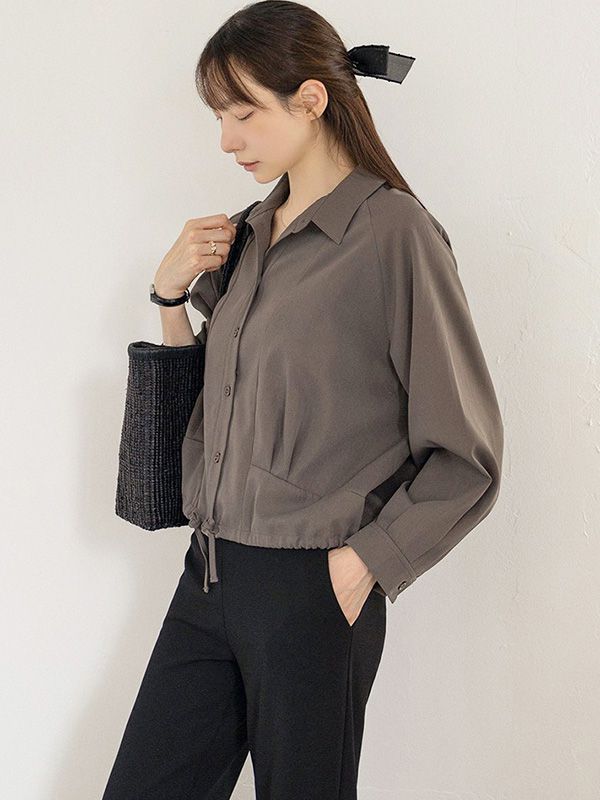【C55598】韓國MCD 雙褶腰襯衫-素面下襬抽繩收腰長袖寬鬆上衣外套