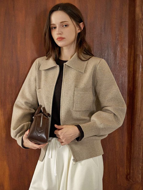 【C55662】韓國DDR 厚實針織外套-翻領素面雙口袋長袖拉鍊外套