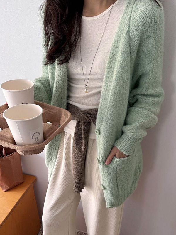 【C53275】韓國MID 鬆軟針織外套-素面混羊毛V領琥珀釦寬鬆長袖上衣_影片★★