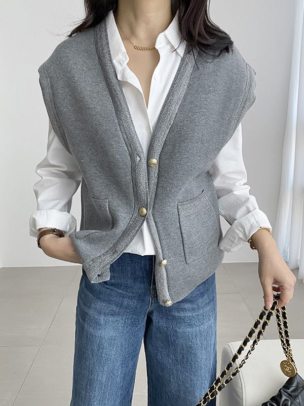 ★限時24H優惠★【C55711】韓國RUN 銀絲滾邊針織衫-素面V領雙口袋排釦無袖背心外套