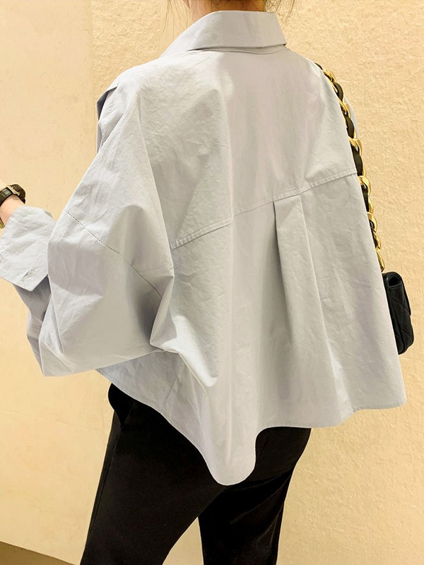 【C56103】韓國SPB 立體褶襯衫上衣-素面寬鬆短版開襟排釦長袖外套