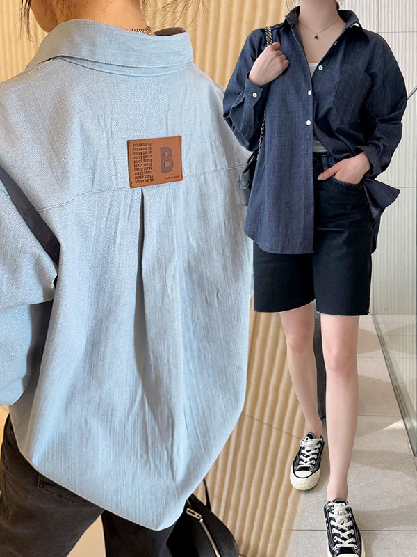 【C56104】韓國SPB 皮革標牛仔襯衫-字母標寬鬆長版口袋長袖上衣外套