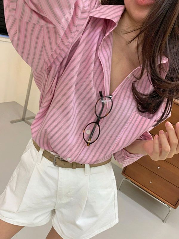 【C54745】韓國SNY 條紋壓褶襯衫-寬鬆好氣色上衣長袖素面外搭_影片★★