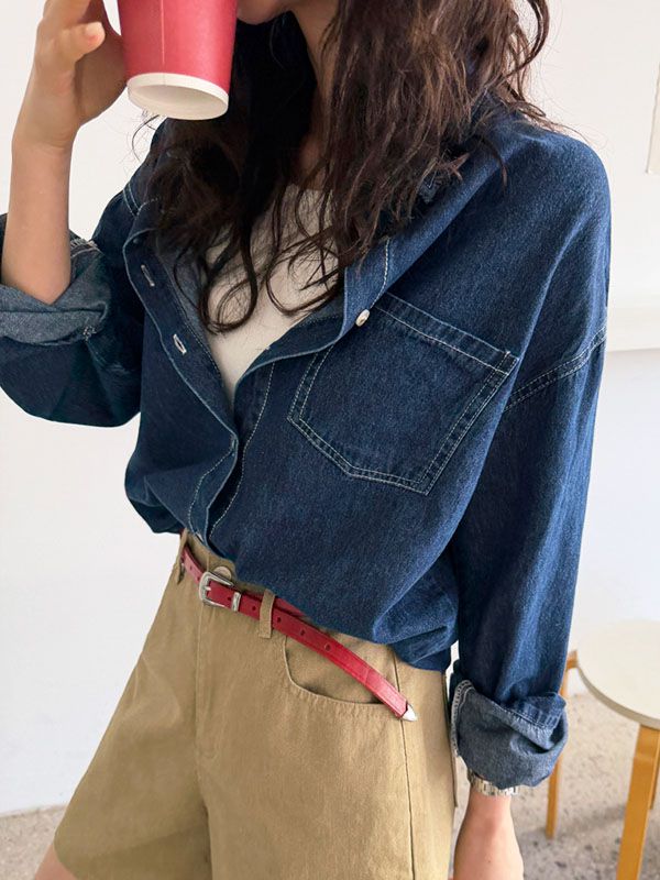 【C55636】韓國DLY 口袋牛仔襯衫-素面弧形下襬開襟排釦長袖上衣外套