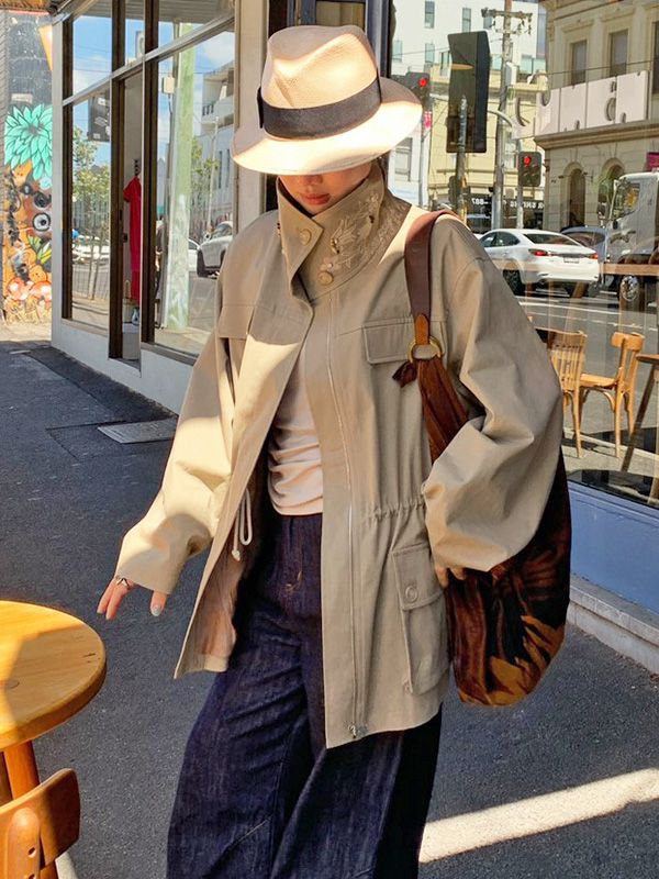 【C51001】韓國MUM 立領A字夾克-寬鬆長版風衣素面純棉長袖外套_影片★★