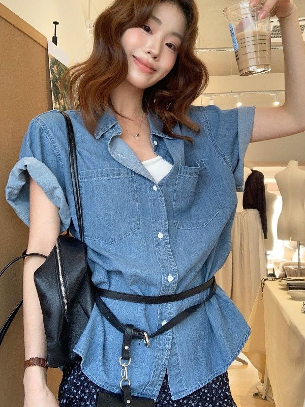 【C59798】韓國MBL 短版牛仔襯衫-長袖上衣外套透氣_影片★★