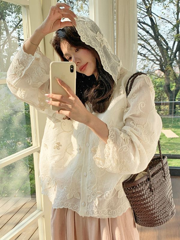 【C56062】韓國DDA 透膚薄紗襯衫-素面前短後長寬袖長袖上衣外套★★