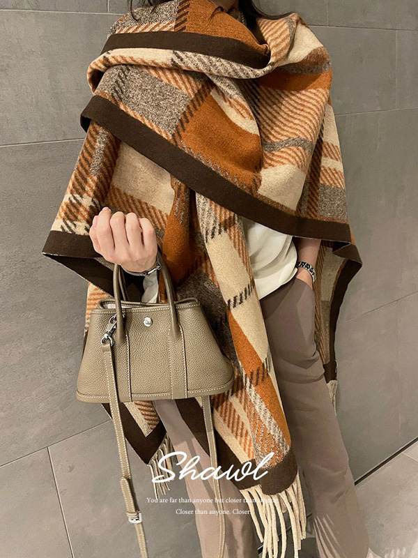 【C55753】韓國MNR 經典格紋披肩-寬大長版毛呢面料流蘇斗篷圍巾配件