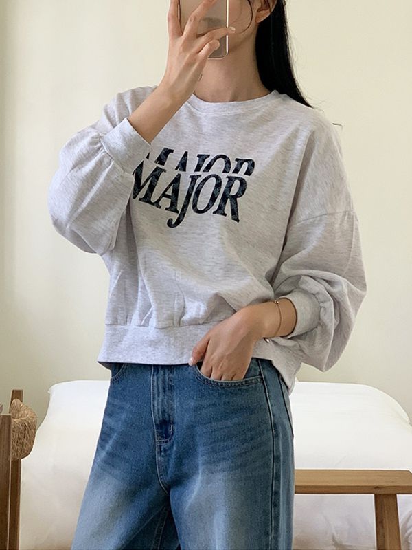 【C55302】韓國CAN 跳色字母大學T-寬鬆圓領刺繡英文短版長袖上衣★★