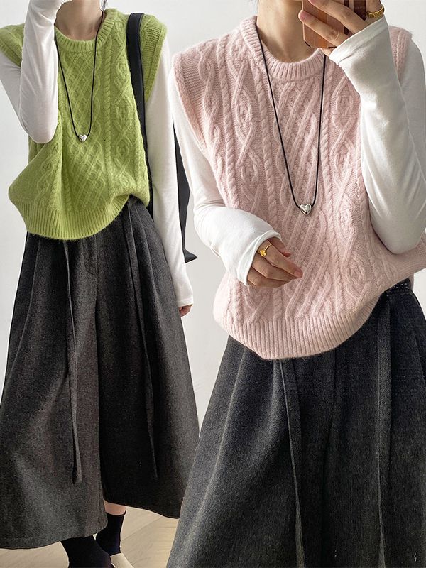 【C51438】韓國JAM 高領背心套裝-素面針織長袖上衣+U領毛毛背心_影片★★