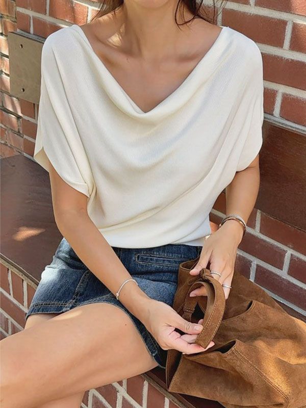 【C55235】韓國NAN 堆堆領針織衫-素面V領連肩袖上寬下窄短袖上衣★★