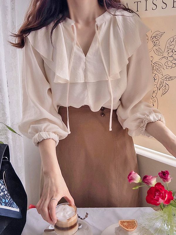 【C55601】韓國LEE 綁帶荷葉領襯衫-婚禮素面V領束口泡泡長袖上衣★★