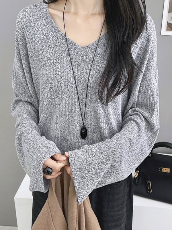 【C55496】韓國GRM 坑條針織衫-素面深V領慵懶落肩寬鬆長袖上衣★★