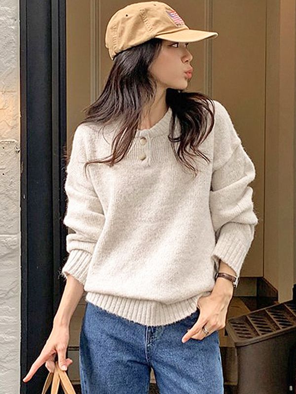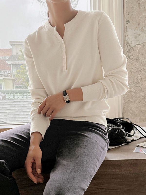 【C55584】韓國JOA 亨利領針織衫-半開襟排釦Y字領親膚素面長袖上衣★★