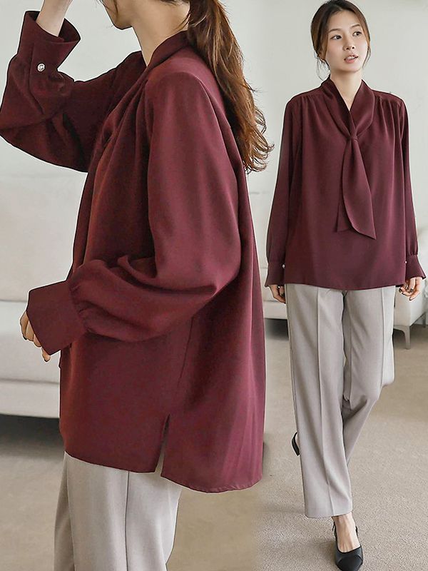 【C55520】韓國BLG 領巾雪紡衫-素面綁帶V領好氣色寬鬆長版長袖上衣★★
