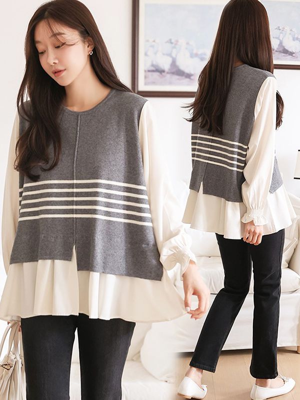 【C55523】韓國NAD 條紋針織衫-雙材質拼接襯衫U領寬鬆傘狀長袖上衣★★