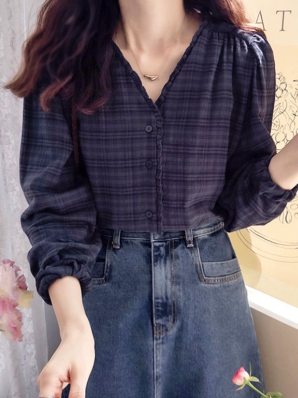 【C55528】韓國LEE 鋸齒花邊襯衫-格紋排釦V領公主袖長袖上衣★★