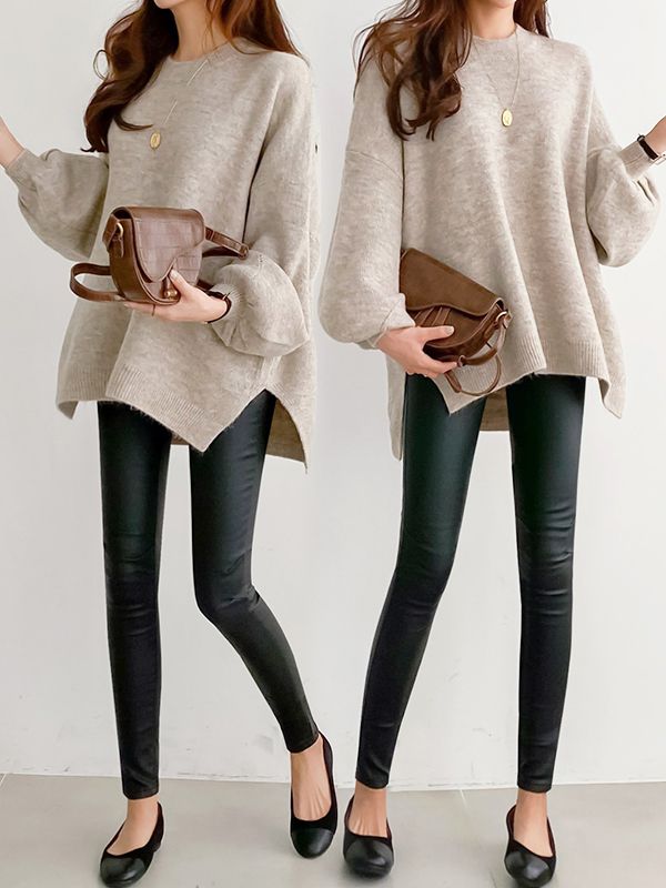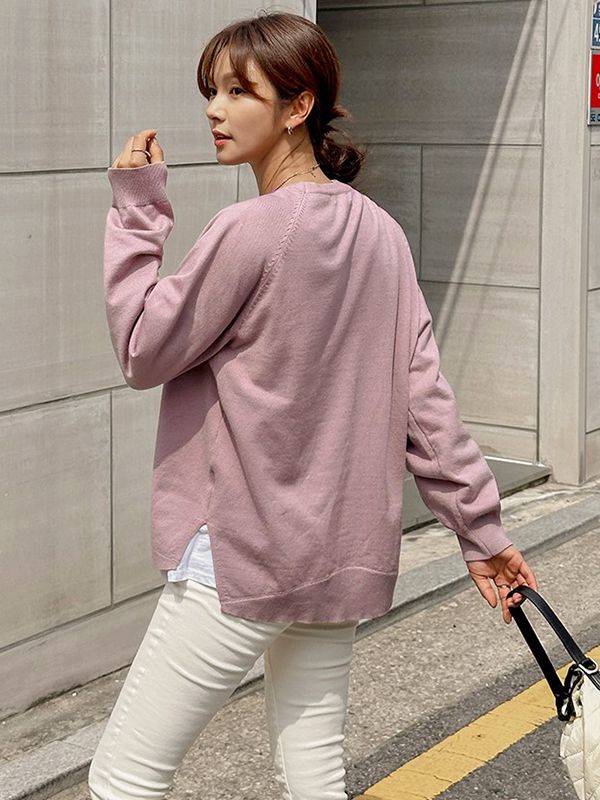 【C55552】韓國PPI 慵懶泡泡袖針織衫-素面圓領寬袖寬鬆長版長袖上衣★★