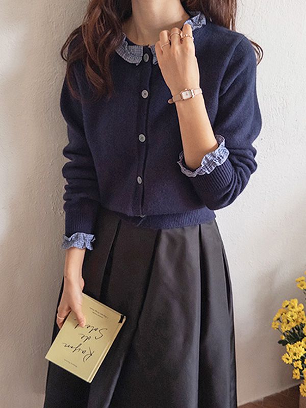 【C55582】韓國LEE 格紋荷葉針織衫-波浪滾邊圓領排釦長袖上衣外套★★