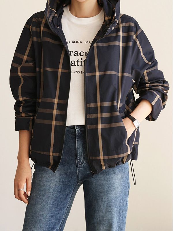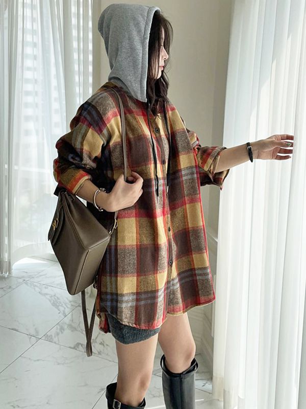 【C55691】韓國MNR 連帽拼接襯衫-格紋寬鬆長版假兩件長袖上衣外套