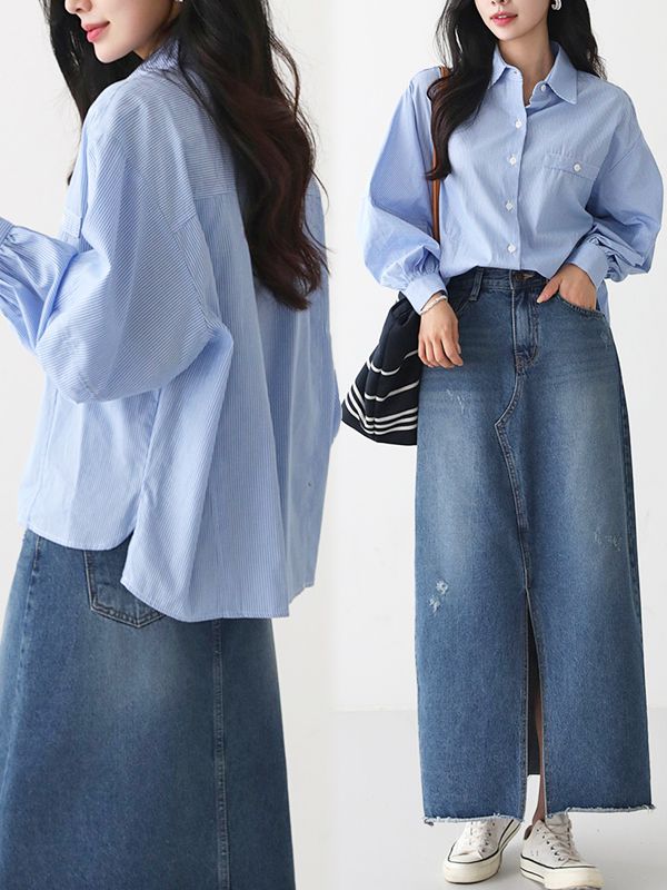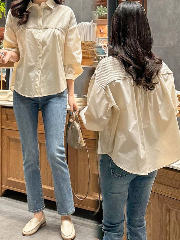 【C55656】韓國PPI 泡泡袖襯衫-寬鬆前短後長素面條紋排釦長袖上衣★★