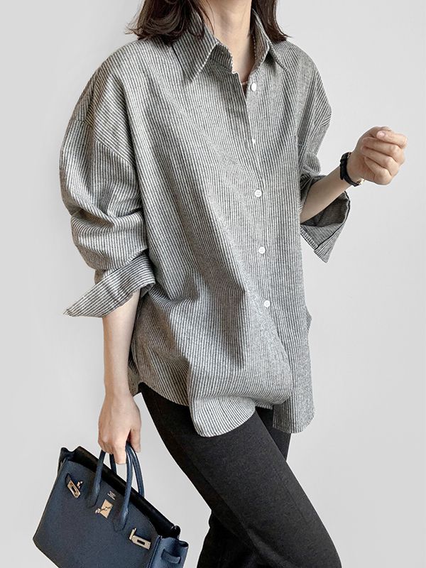 【C55607】韓國GRC 立體車線襯衫-寬鬆弧形下襬長版直條紋長袖上衣★★