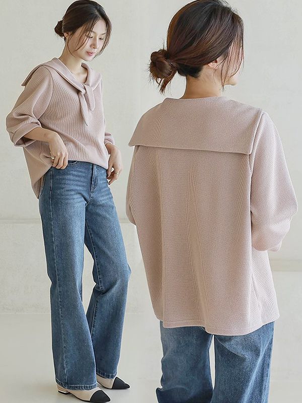 【C55608】韓國BLG 綁結水手領上衣-坑條素面好氣色V領七分袖寬袖★★