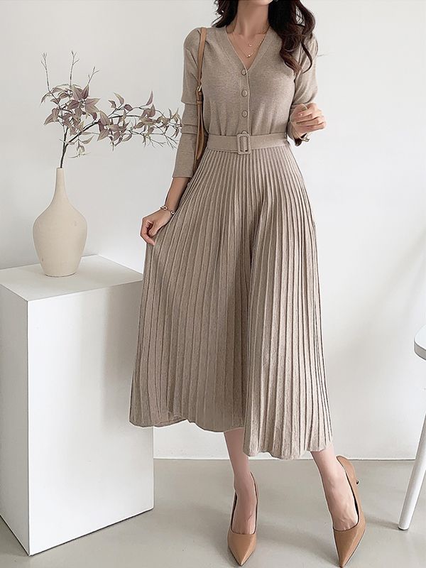 【C55621】韓國NK2 針織V領洋裝-半開襟立體坑條素面皮帶長袖連身裙★★