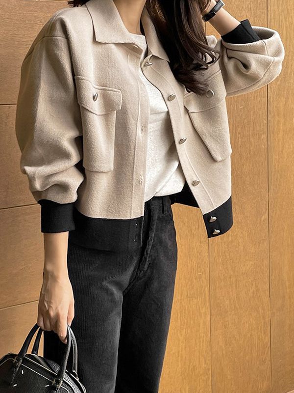 【C55625】韓國MAZ 色塊口袋外套-針織排釦跳色滾邊短版素面長袖夾克★★