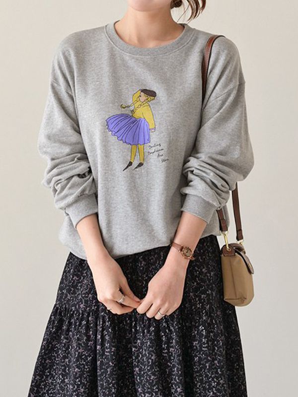 【C55634】韓國DLY 蓬裙女孩大學T-圓領復古人像印花寬鬆長袖上衣★★