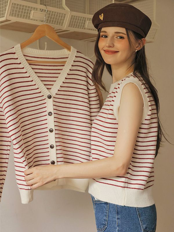 【C55641】韓國MID 條紋針織衫套裝-圓領無袖背心上衣+長袖排釦外套★★