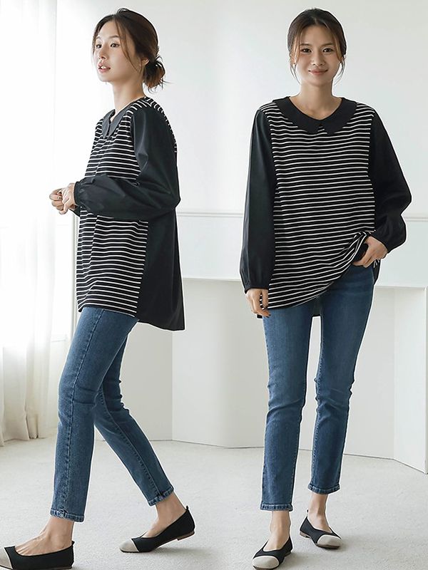 【C55650】韓國BLG 條紋傘狀上衣-雙材質拼接V領寬鬆長版領片長袖★★
