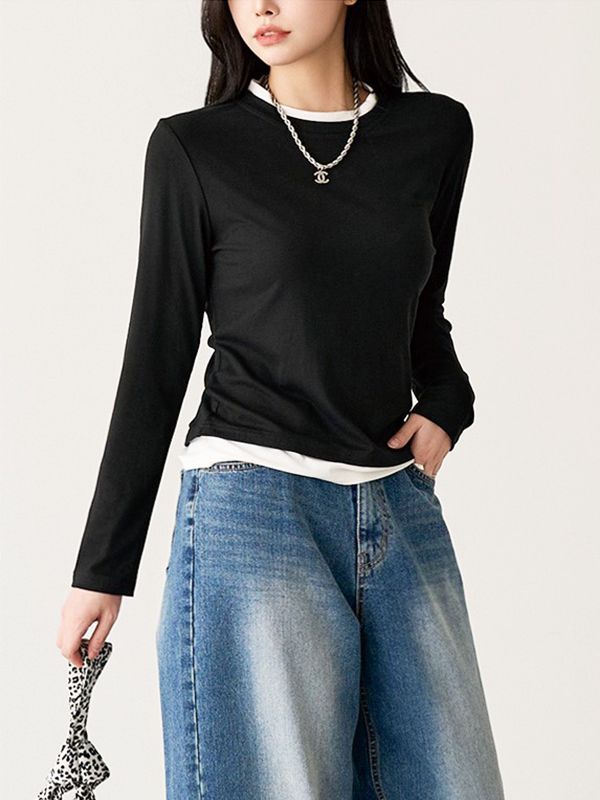 【C55659】韓國PPI 小立領素面T恤-假兩件拼接滾邊圓領輕薄長袖上衣★★